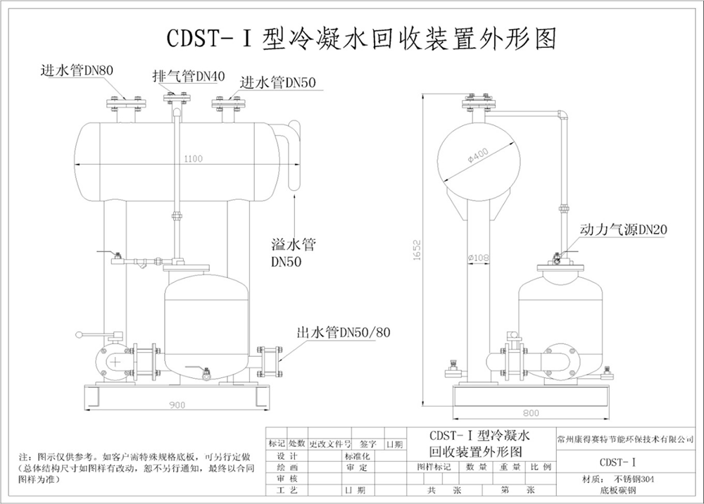 CDST系列冷凝水氣動(dòng)機(jī)械回收組合泵裝置廣泛應(yīng)用于石化、印染后整理、水洗、醫(yī)院、木材加工、食品烘干、造紙行業(yè)、飲料釀造、建筑樓宇等使用蒸汽能源的行業(yè),為企業(yè)節(jié)能減排,資源循環(huán)利用提供了幫助。本系列裝置將所有的附件完整地安裝在一個(gè)鋼制框架中,整體設(shè)計(jì)優(yōu)良,全不銹鋼304制作,方便現(xiàn)場(chǎng)接管安裝,無(wú)需電源(使用蒸汽或壓縮氣體作為動(dòng)力),適用于危險(xiǎn)、骯臟和潮濕環(huán)境,泵體內(nèi)部全機(jī)械結(jié)構(gòu),無(wú)電泵固有的汽蝕和機(jī)械密封現(xiàn)象,減少維修費(fèi)用和停機(jī)時(shí)間,確保工作性能運(yùn)行穩(wěn)定可靠,現(xiàn)場(chǎng)無(wú)需大水槽,降低了成本,是冷凝水回收的理想設(shè)備。CDST-Ⅱ型連續(xù)輸送冷凝水回收裝置已申請(qǐng)國(guó)家發(fā)明專利(申請(qǐng)專利號(hào):201210000626.3)。本公司在2012年2月21日將康得賽特成功注冊(cè)為注冊(cè)商標(biāo)。